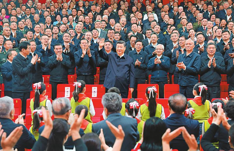 9月24日晚,庆祝新疆维吾尔自治区成立70周年文艺晚会《美丽新疆》在乌鲁木齐文化中心大剧院举行。中共中央总书记、国家主席、中央军委主席习近平观看演出。这是习近平向观看演出的新疆各族干部群众挥手致意。新华社记者 丁林 摄
